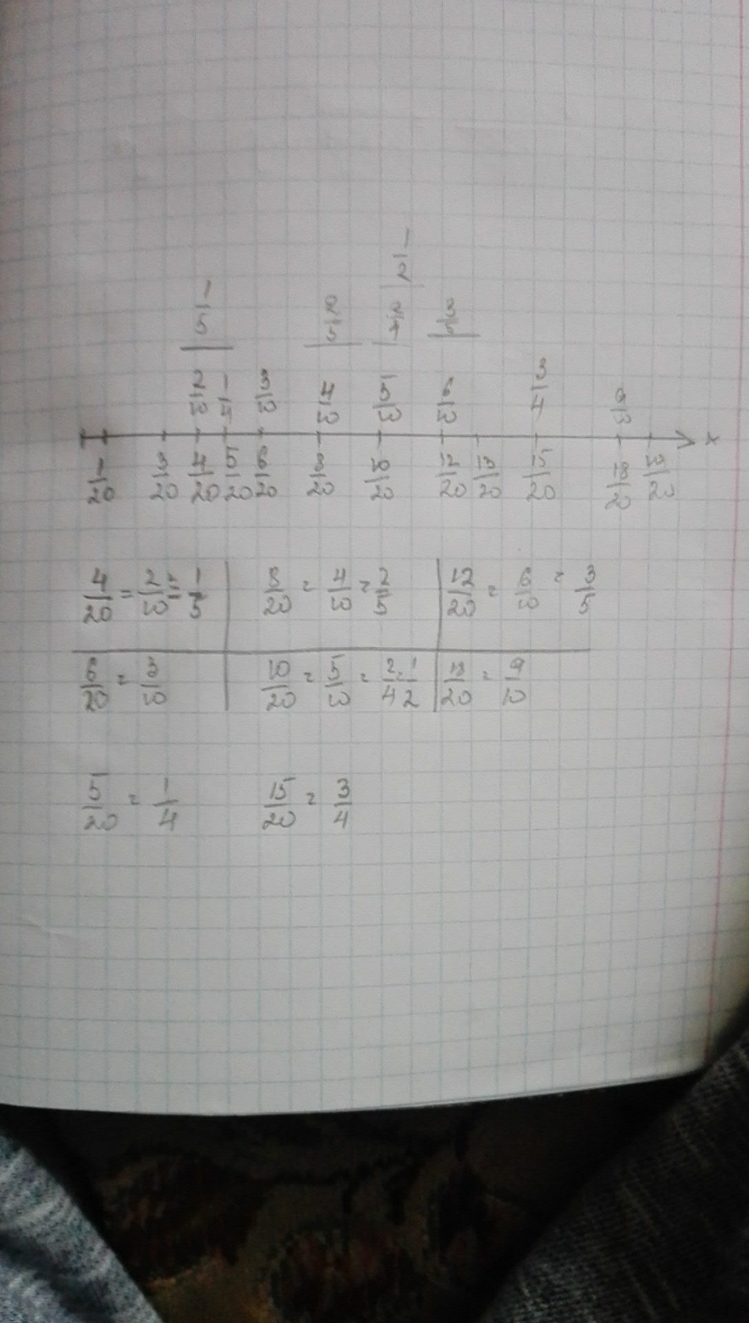 Начертите координатный луч, взяв за единичный отрезок, длина которого в 20 раз больше стороны клетки тетради. Отметьте на луче точки, соответствующие числам: 1/20, 3/20, 4/20, 5/20, 6/20, 8/20, 10/20, 12/20, 13/20, 15/20, 18/20, 19/20, 2/10, 3/10, 4/10, 5/10, 6/10, 9/10, 1/5, 2/5, 3/5, 1/4, 2/4, 3/4, 1/2. Какие из этих чисел изображаются на луче одной и той же точкой? Запишите соответствующие равенства.
