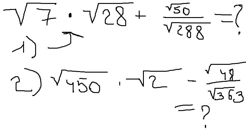 1) воспользуемся свойствами корня и объединим под одним корнем 7 с 28 и 50 с 288. 28 можно разложить на 7 и 4. Поэтому произведение, которое мы с лёгкостью выносим из-под корня равно 14. Затем идём к дроби: 50 и 288 сократим на 2. Получим 25 в числителе и 144 в знаменателе. Их легко выносим из-под корня: 5/12. Считаем получившееся: 14+5/12=14,41...=14 целых 5/12