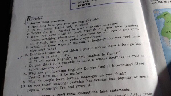 1.как долго ты учишь английский? 2.Ты учишь английский только в школе? 3.Где еще ты позитивно учишь иностранные языки? 4.Как ты трудишься изучать английский ? (книги для чтения, смотришь программы изучения из ТВ,видео или фильмына англ., слушаешь программы по радио.5.Какой из этих выбранных вариантов ты находишь более эффективным и Почему? 6.