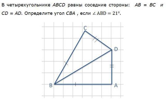 в четырехугольнике abcd равны соседние стороны ab=bc и cd=ad определите угол cba если угол abd=21
