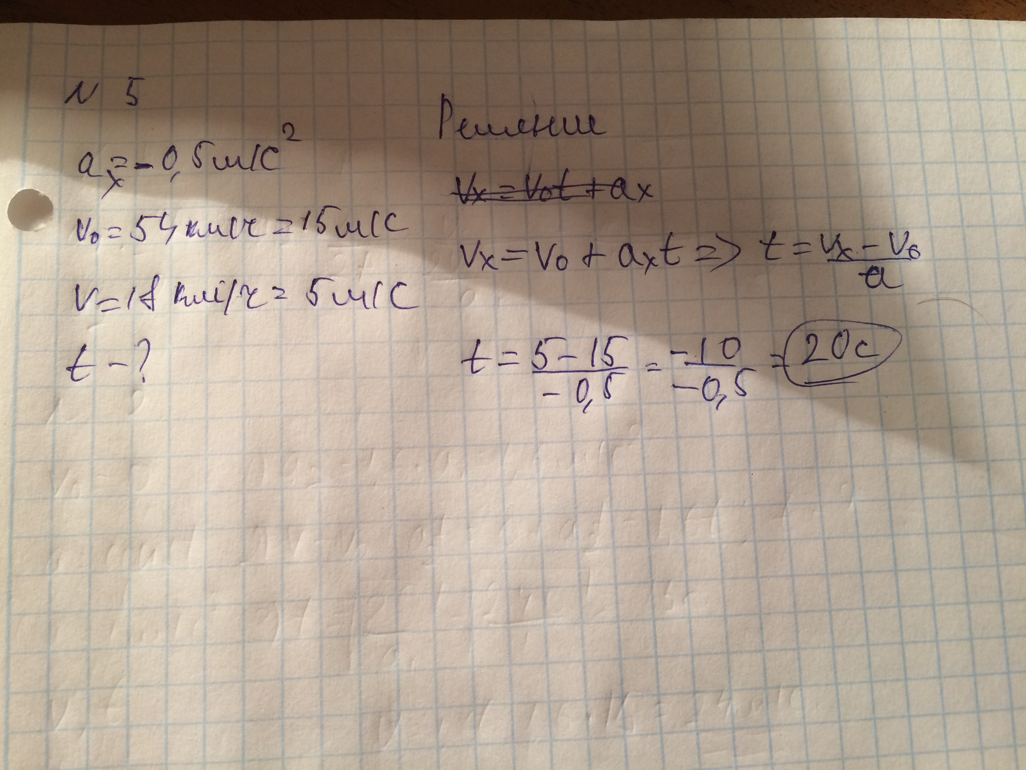 автомобиль двигается с ускорением -0.5 м/c2. Он уменьшил свою скорость от 54 до 18 км/ч. Сколько времени ему понадобилось?
