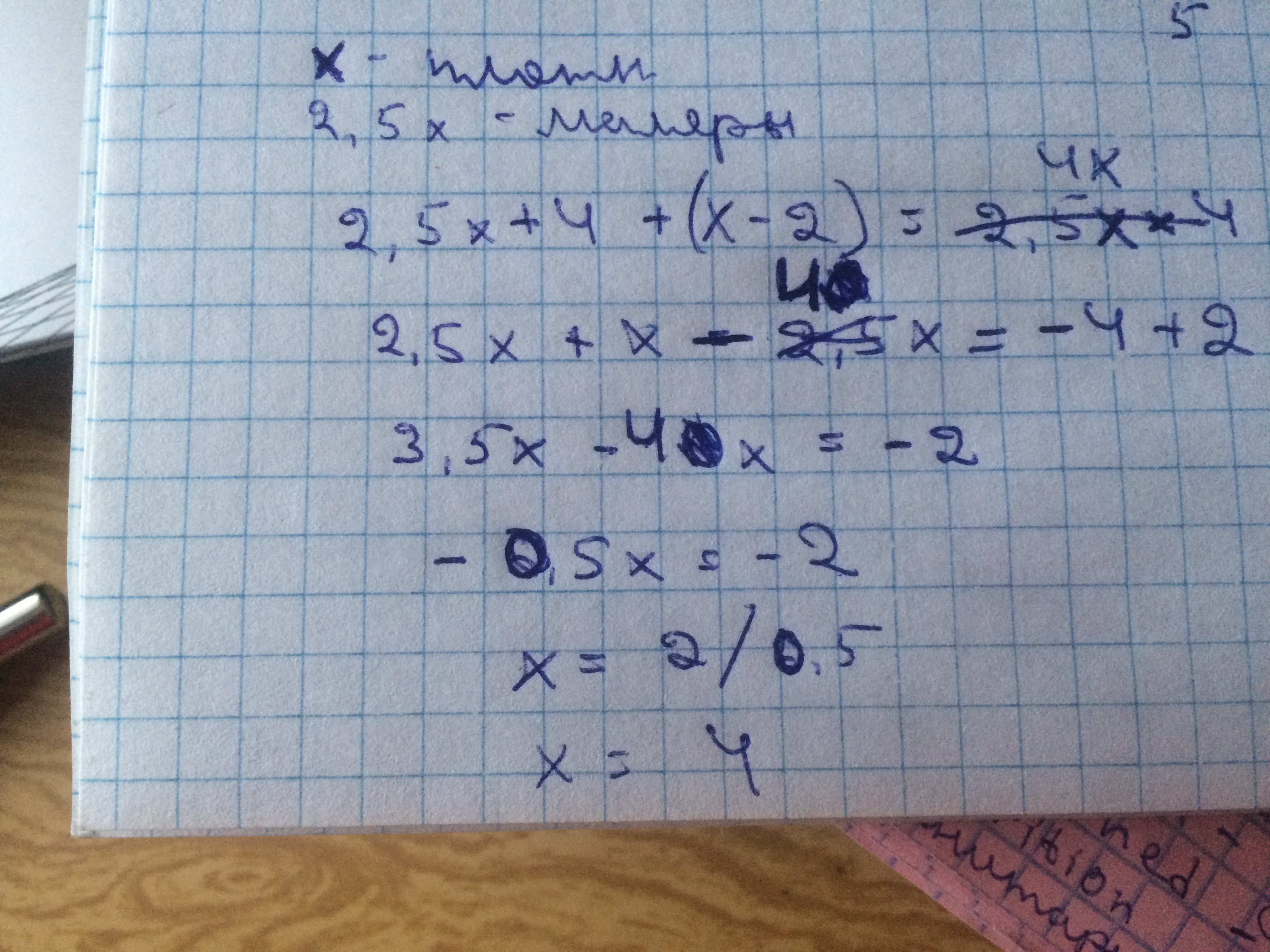 Для ремонта школы прибыла бригада, в которой было в 2,5 раза больше маляров, чем плотников. Вскоре прораб включил в бригаду ещё четырёх маляров, а двух плотников перевёл на другой объект. В результате маляров в бригаде оказалось в 4 раза больше, чем плотников. Сколько маляров и сколько плотников было в бригаде первоначально?