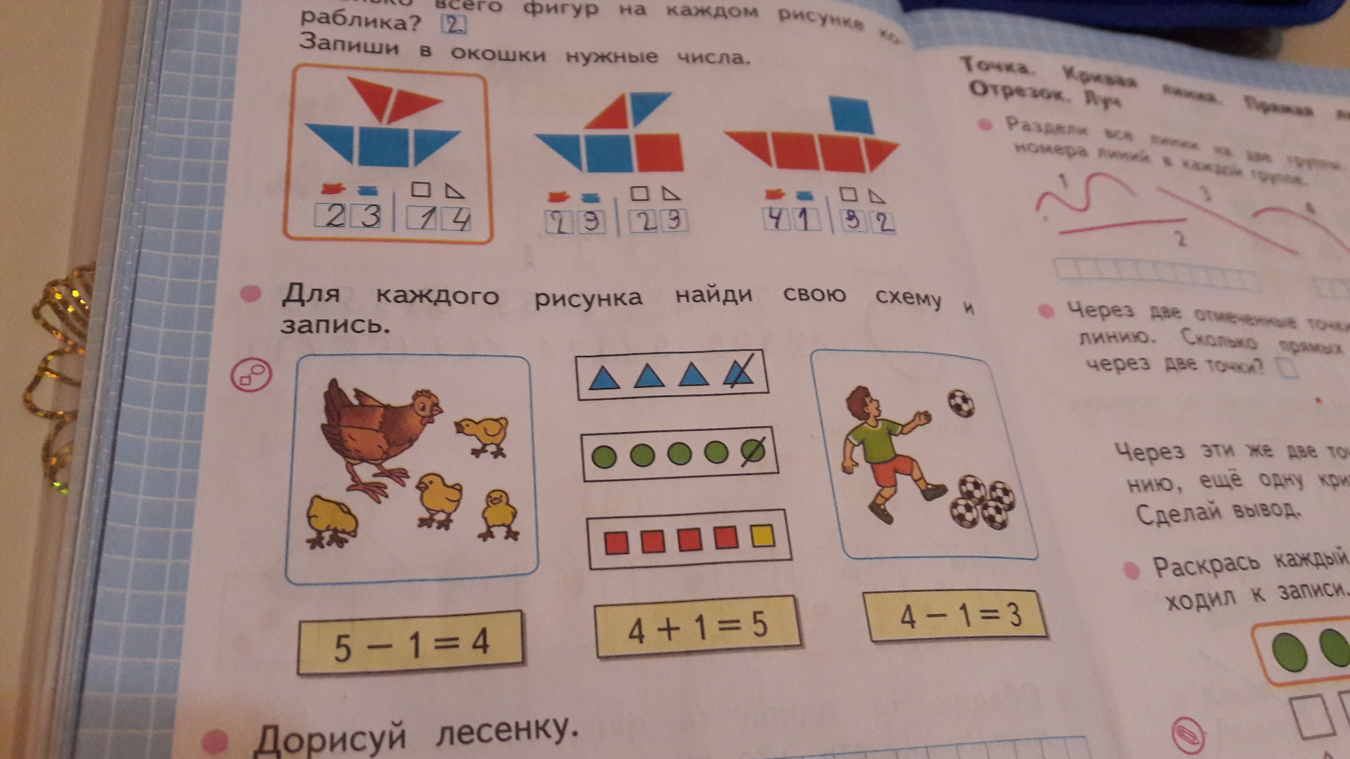 Схема: 5 зеленых кружков (мячи), один из них зачеркнут (его взял мальчик)