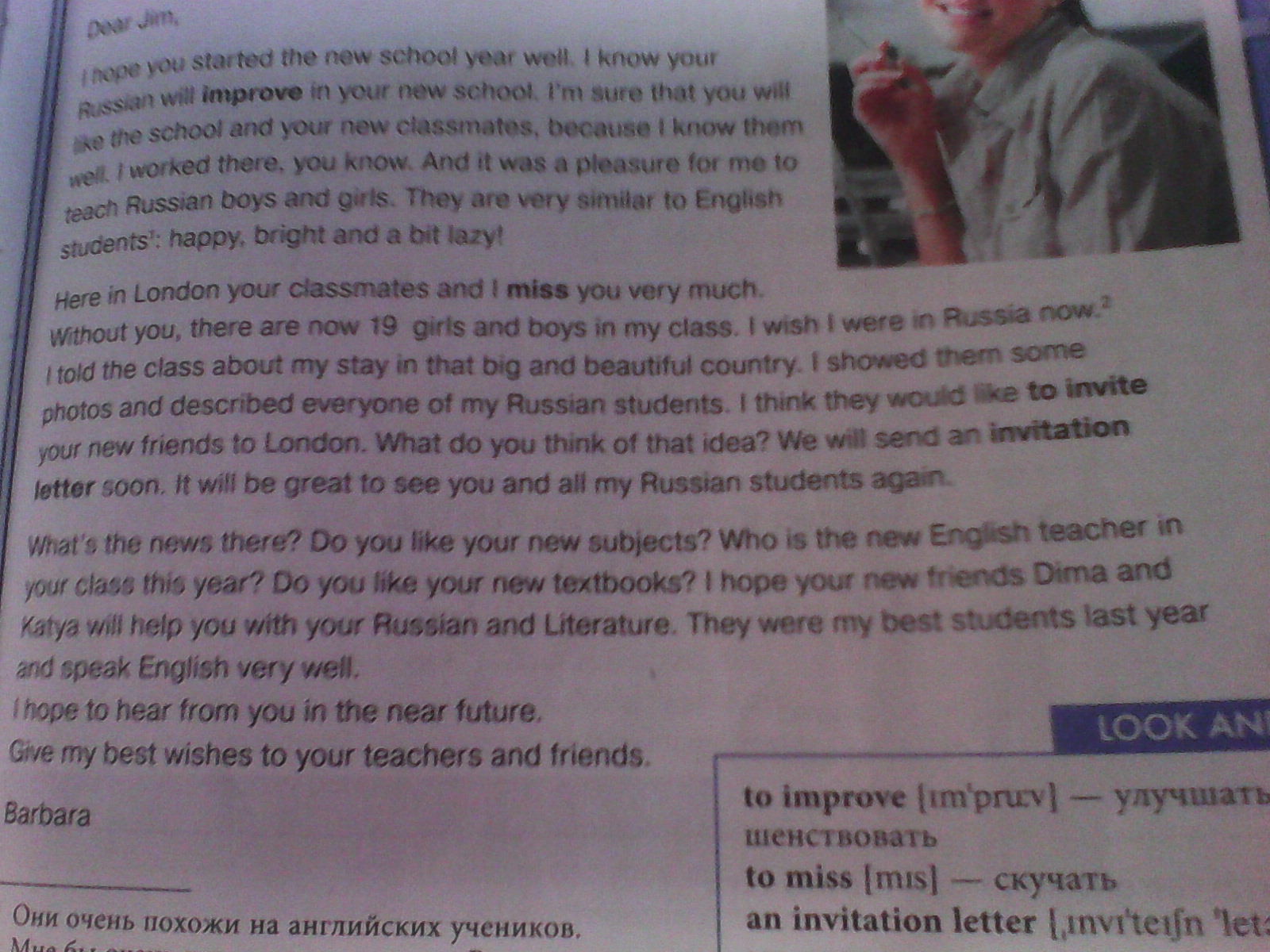 Какое там новости? Тебе нравятся новые предметы? Кто новый учитель по английскому в вашем классе в этом году? Тебе понравились ваши новые учебники? Я надеюсь твои новые друзья Дима и Катя помогут тебе по русскому и литературе. Они были моими лучшими учениками в прошлом году и очень хорошо говорят по английски. Надеюсь услышать от тебя в ближайшем будущем. Передай приветы твоим учителям и друзьям.