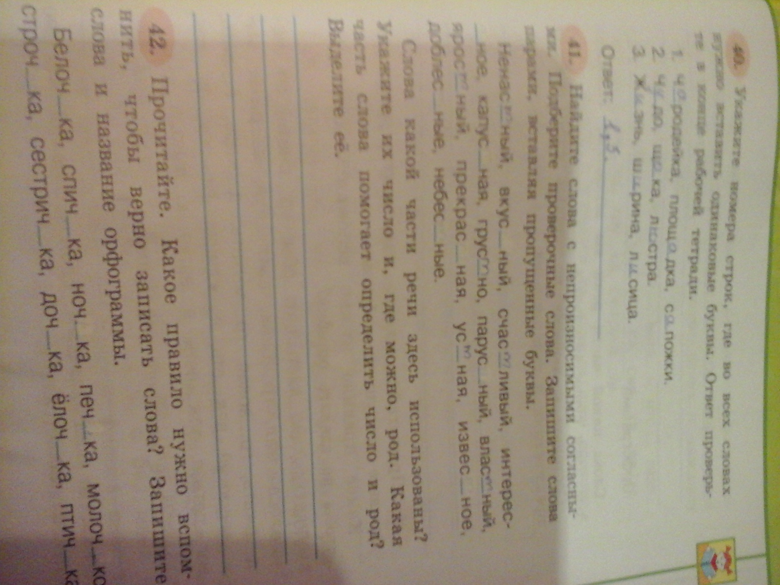 Найдите слова с непроизносимыми согласными. подберите проверочные слова. запишите слова парами, всавляя пропущенные буквы. Ненас_ный, вкус_ный, счас_ливый, нитерес_ное, капус_ная, грус_но,_ парус_ный, влас_ный, ярос_ный, поекрас_ная, ус_ная, извес_ное, доблес_ные, небес_ные. Слова какой части речи здесь использованы? Укажите их число и, где можно, род. Какая часть слова помогает определить число и род? Выделите ее.