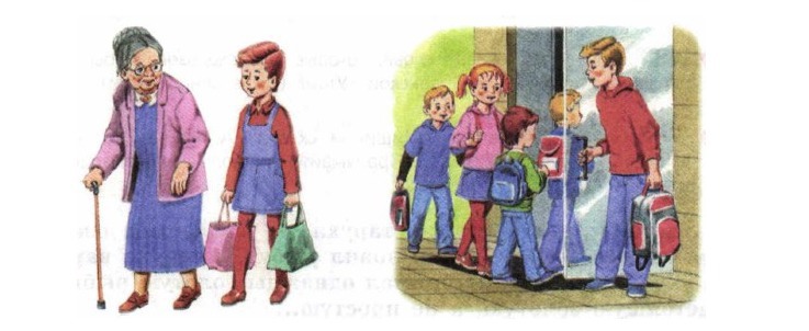 На первой картинке девочка несет сумки пожилой бабушки,а на второй картинке мальчик держит дверь,чтобы прошли дети .Когда ты омогаешь кому-то,то это делает тебя добрее и вежливее.