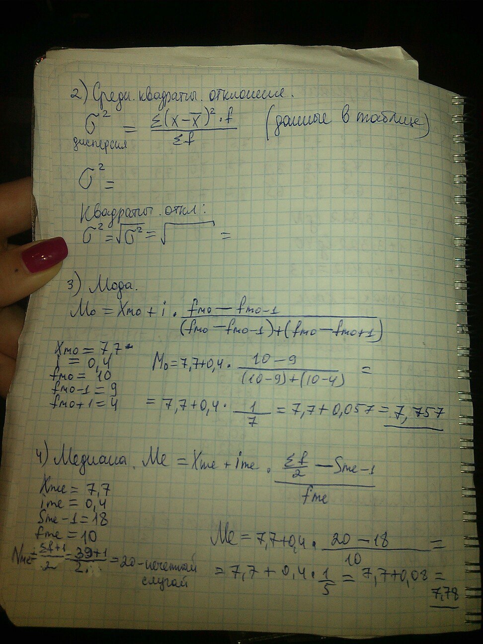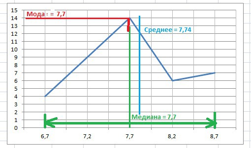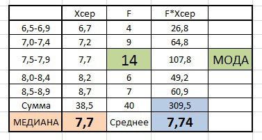 МОДА - это по максимальной частоте -> F=14 при Х=7,7, а МЕДИАНА - это среднее значение интервала от 6,7 до 8,7 = 7,7. В нашем случае ПЯТЬ диапазонов и числа совпали, но это не обязательно. При более точном расчете - МОДА = 7,8, а МЕДИАНА = 7,75.