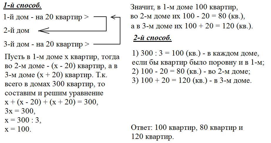 В трёх домах 300 квартир. В первом доме на 20 квартир больше,чем во втором и на 20 квартир меньше,чем в третьем. Сколько квартир в каждом из этих домов?