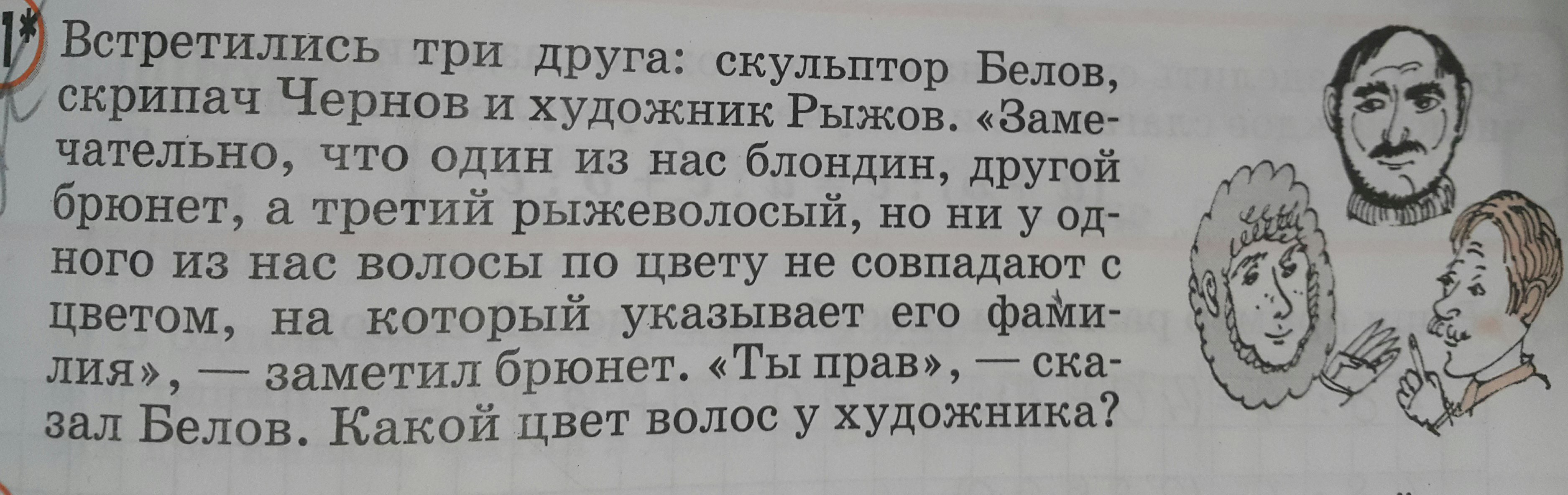 Белов - рыжий, Чернов - блондин, Рыжов - брюнет. Художник - брюнет