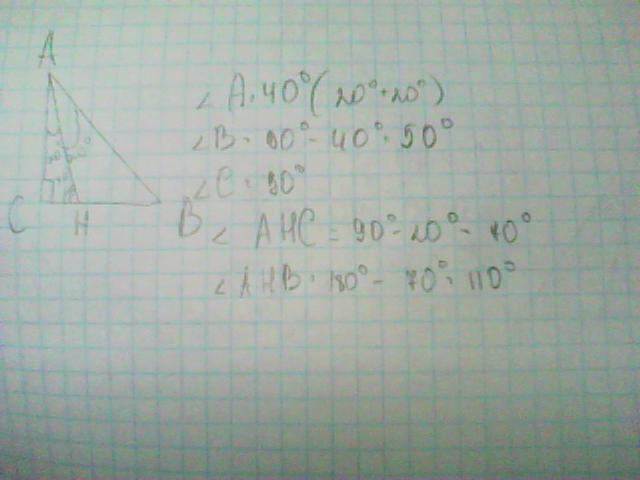 В прямоугольном треугольнике из вершины острого угла проведена бессектриса,которая образует углы по 20 градусов. Найдите все полученные углы.
