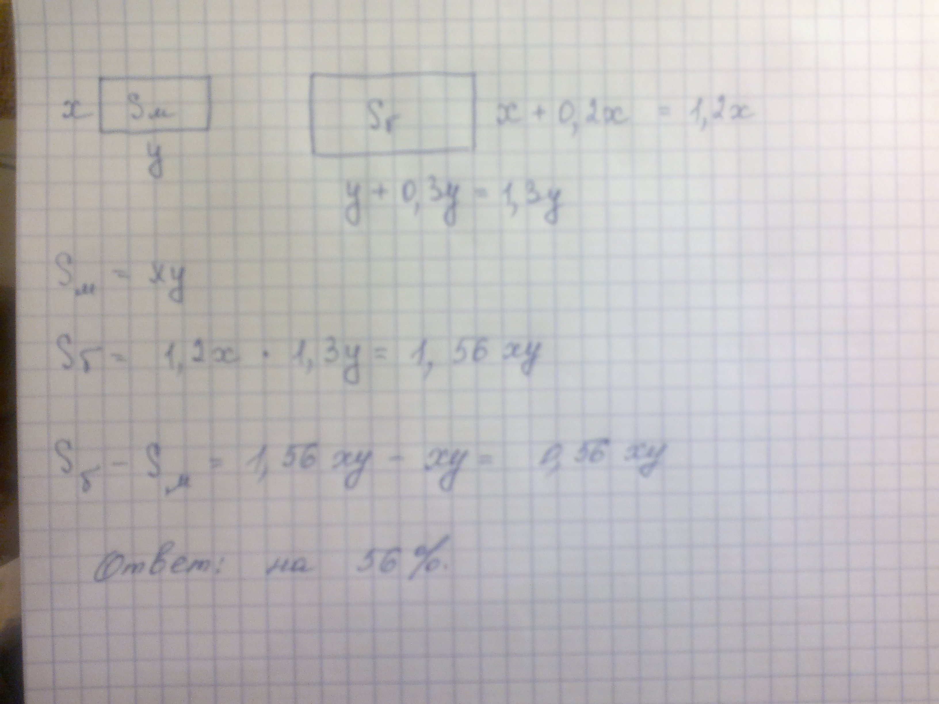 ребят можно с обьяснением: на сколько процентов увеличится площадь прямоугольника если его длину увеличить на 30% а ширину на 20% срочно