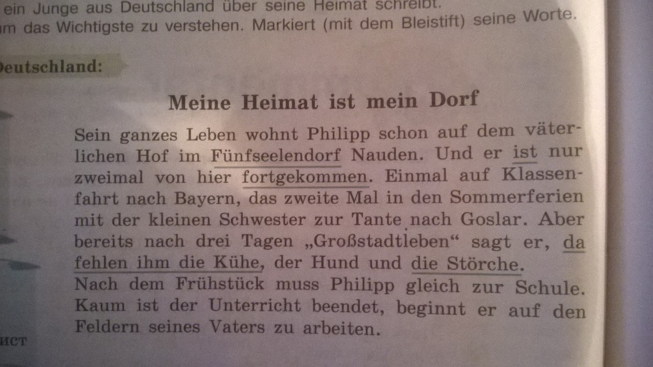 Всю свою жизнь Филипп живёт в доме своего отца в деревушке Науден. Отсюда он уезжал всего лишь два раза. Первый раз -- в поездку с классом в Баварию,а второй -- на летних каникулах с младшей сестрёнкой к тёте в Гослар. Но уже через три дня жизни в большом городе он сказал,что ему не хватает коров,собаки и аистов. После завтрака Филипп должен сразу идти в школу. Сразу по окончании урока он начинает работать на полях своего отца. "Крестьянин -- это круглосуточная работа",считает он. Только зимой у Филиппа немного больше времени. Родина? "Когда я прихожу домой,меня встречает запах сена и тёплого молока,фруктовых деревьев и дерева. Я считаю,что это просто естественно и прекрасно" Поэтому Филипп не хочет жить в городе. "Науден -- это моя Родина,семья,Германия и вообще всё,что окружает меня",считает он.