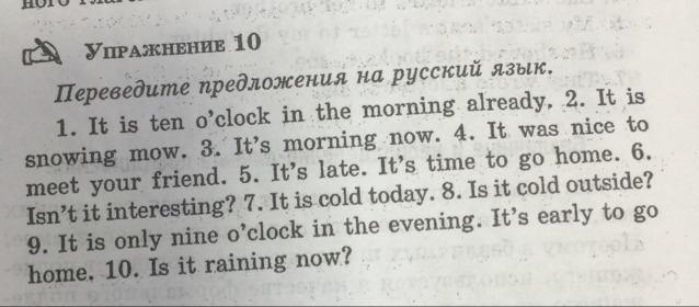 Це в десять годин вже вранці.Це сніг косити.Його вранці.Було приємно познайомитися з вашою подругою.Його пізно.Його час, щоб піти додому.Хіба це не цікаво?Сьогодні холодно.Хіба це холодно?Це всього лише дев'ять годин вечора.його рано, щоб піти додому.Зараз дощ?