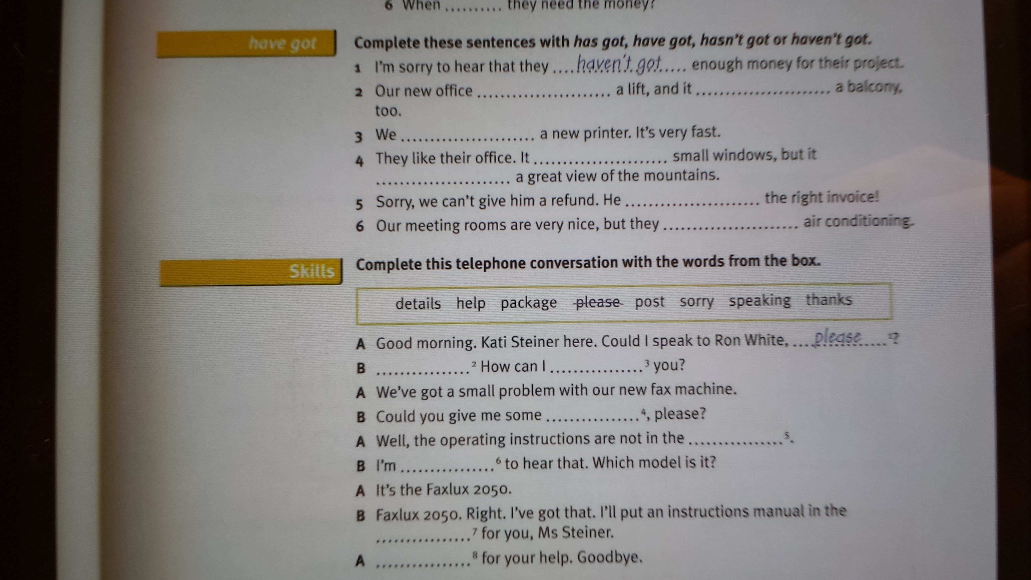 Have got задание) 2. Has got, has got. 3. have got. 4. Has got, has got. 5. Hasn't got. 6. Haven't got. Skills задание) 2. Speaking. 3. Help. 4. Details. 5. Package. 6. Sorry. 7. Post. 8. Thanks.