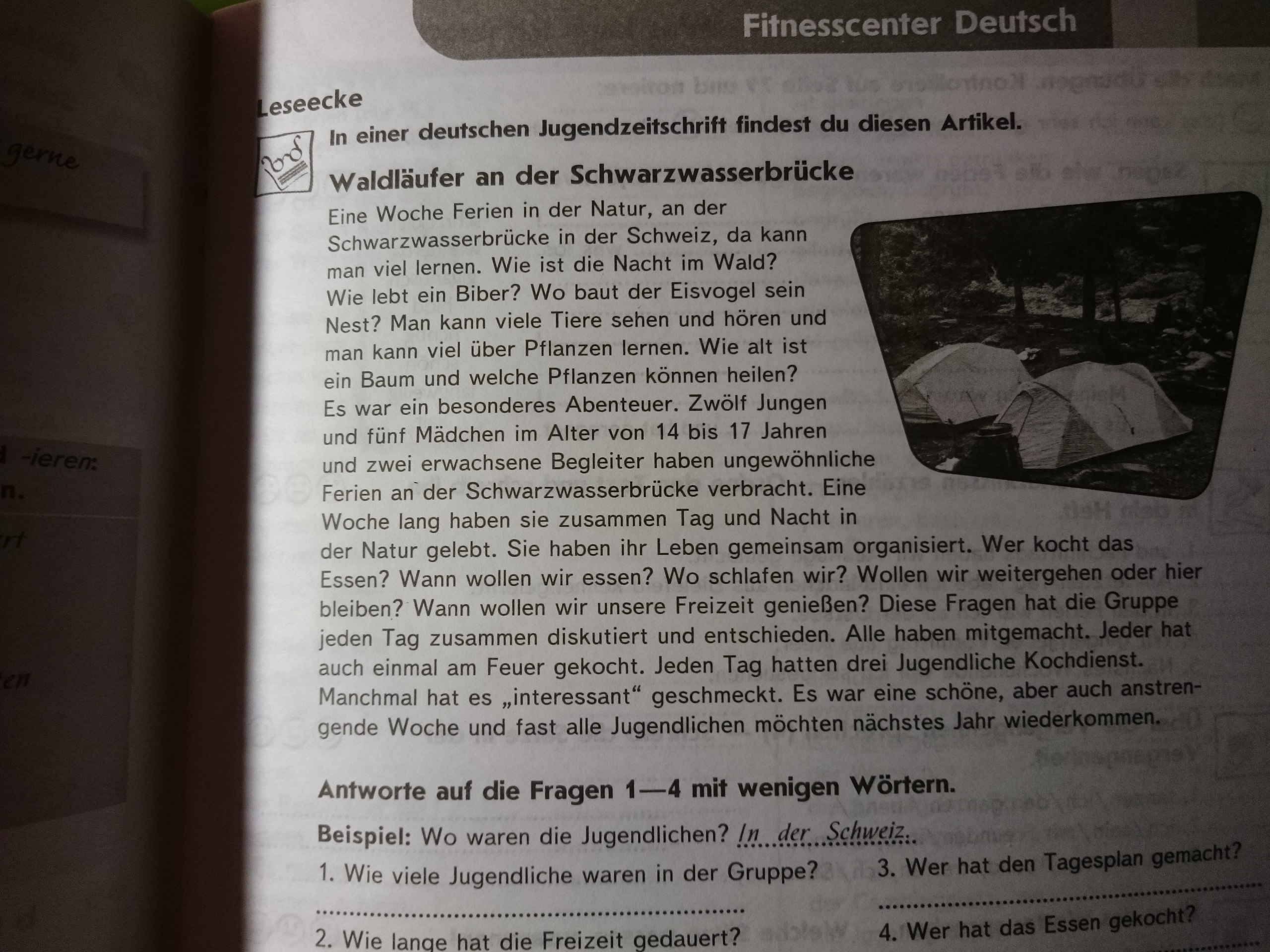За целую неделю каникул, проведенных на природе в Швейцарии в Шварцвассербрюке, могут многому научить. Какова ночь в лесу? Как живет бобер? Где строит зимородок свое гнездо? Можно увидеть и услышать многих животных, а также узнать многое о растениях. Каков возраст дерева и какие травы -лекарственные. Это было особенным приключением. Двенадцать мальчиков и пять девочек, в возрасте от 14 до 17 лет и два взрослых сопровождающих, провели незабываемые каникулы на Шварцвасербрюке. Целую неделю день и ночь жили они все вместе на природе. Они вместе обустроили свой быт. Кто готовит еду? Когда мы будем принимать пищу? Где мы будем спать? Хотим ли мы пойти дальше или остаться здесь? Когда мы хотим воспользоваться нашим свободным временем? Все эти вопросы группа обсуждала и решала сообща каждый день. Все принимали участие. Каждый готовил хоть раз на костре. Каждый день трое подростков дежурили на кухне. Иногда у блюд был "интересный" вкус. Это была прекрасная, хоть и утомительная неделя и почти все ребята захотели вернуться в следующем году.