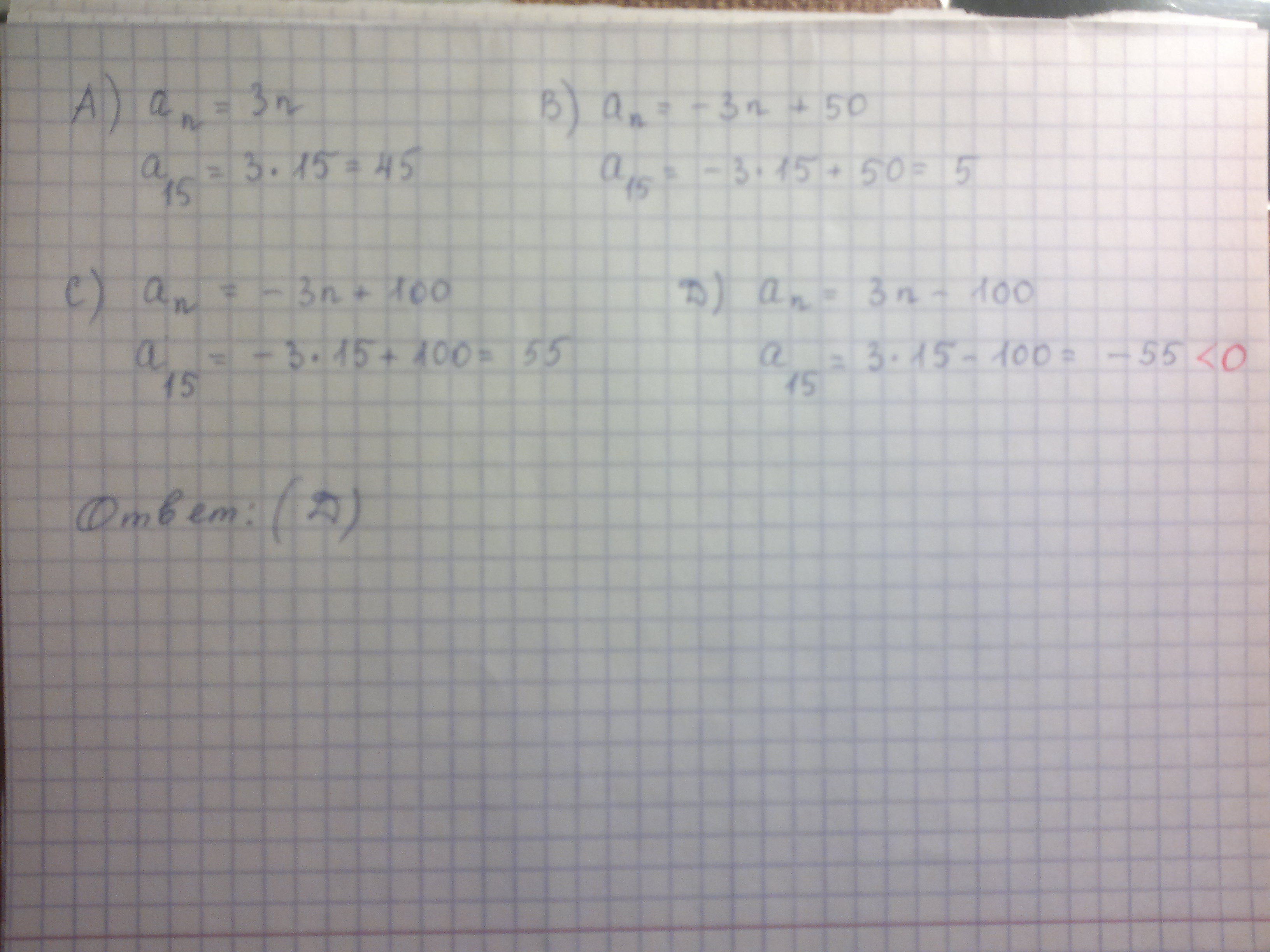 D) a₁₅ = 3*15 - 100 = 45 - 100 = -55; -55<0