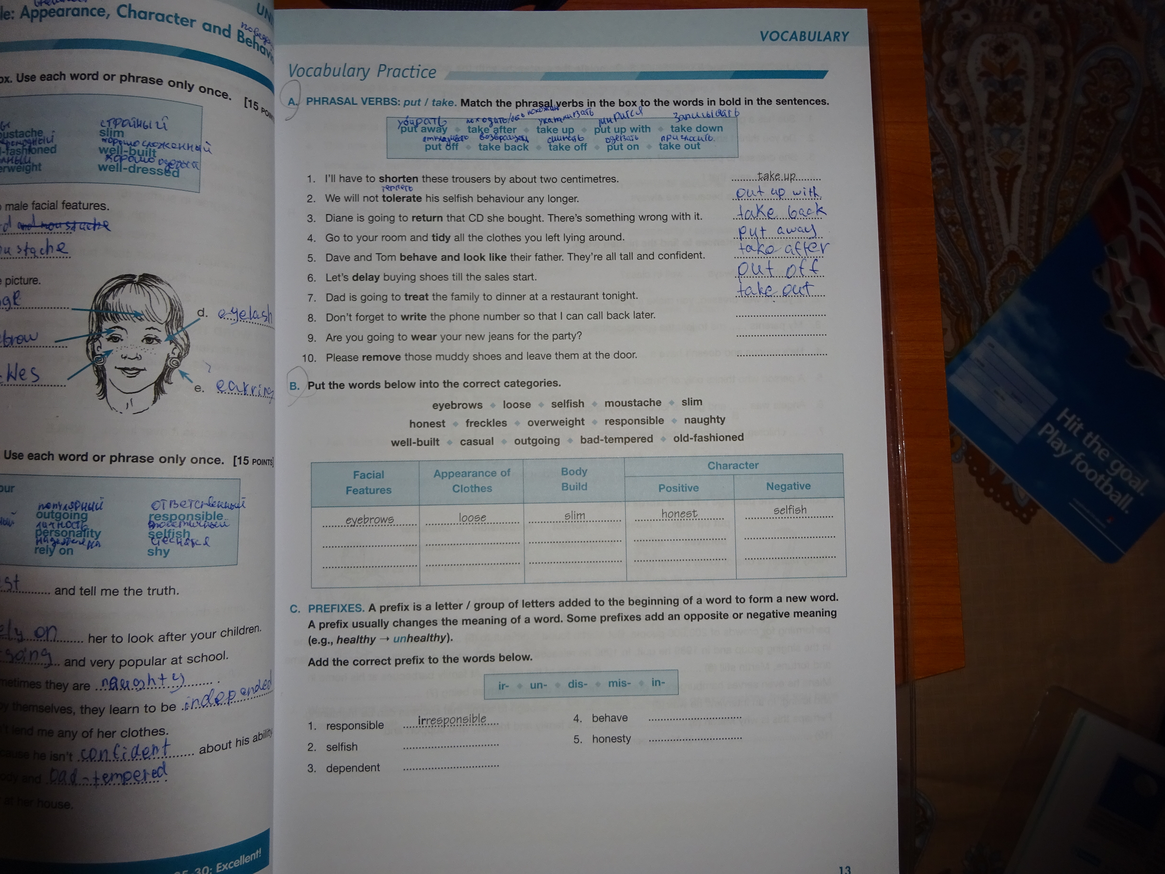А) 8. Take down. 9. Put on. 10. Take off. Остальное правильно написано. В) столбики пронумерую 1-5 в порядке как написано. Moustache- 1, freckles - 1, overweight - 3, responsible - 4, naughty - 5, well-built - 3, casual - 2, outgoing - 4, bad-tempered - 5, old-fashioned -2.
