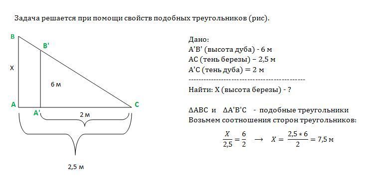 Длина тени дуба, высота которого 6 м, в солнечный день равна 2 м. Какова высота растущей недалеко березы, если длина ее тени 2,5 м?