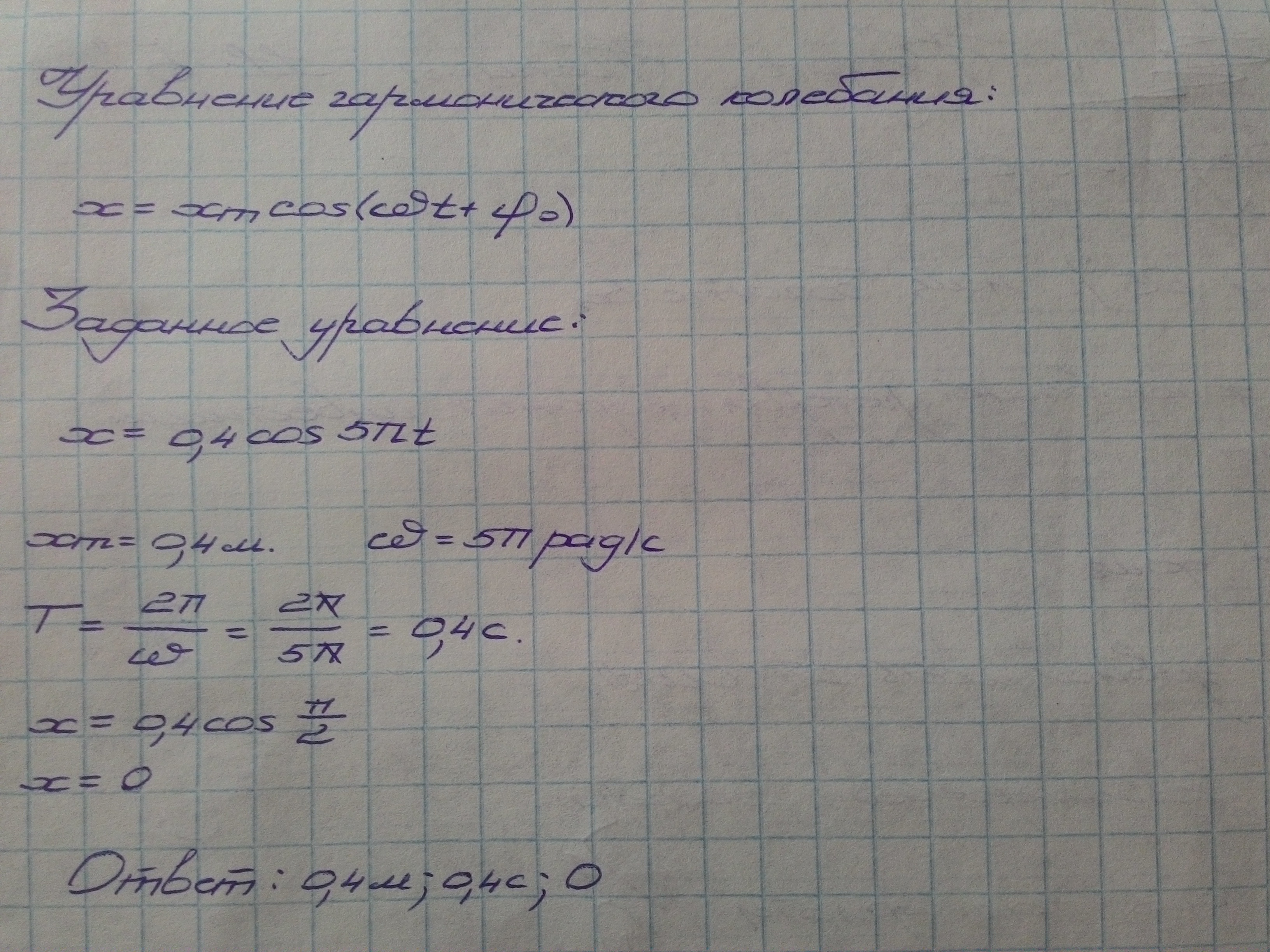 Давно уравнение колебательного движения x=0,4cos 5П t. Определить амплитуду, период колебаний и смещение при t=0,1с