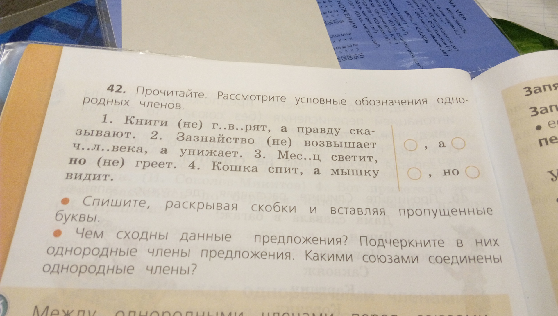 Книги не говорят, а правду сказывают. Зазнайство не возвышает человека, а унижает. Месяц светит, но не греет. Кошка спит, а мышку видит.