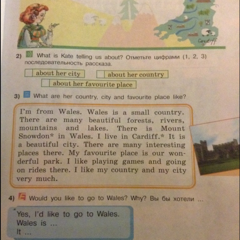 из Уэльс.Уэльс это маленькая страна.Там много лесов гор озер и рек.Здесь есть горы Сноудон в Уэльсе.Я живу в Кардифе.Это красивый город.Здесь много интересных мест.Мое любимое место это прекрасный парк.Я люблю играть игры и там кататься на атракционах.Я очень люблю свою страну и мой город.