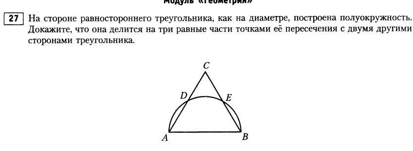 на стороне равностороннего треугольника, как на диаметре, построена полуокружность. Докажите, что она делиться на три равные части точками её пересечения с двумя другими сторонами треугольника.