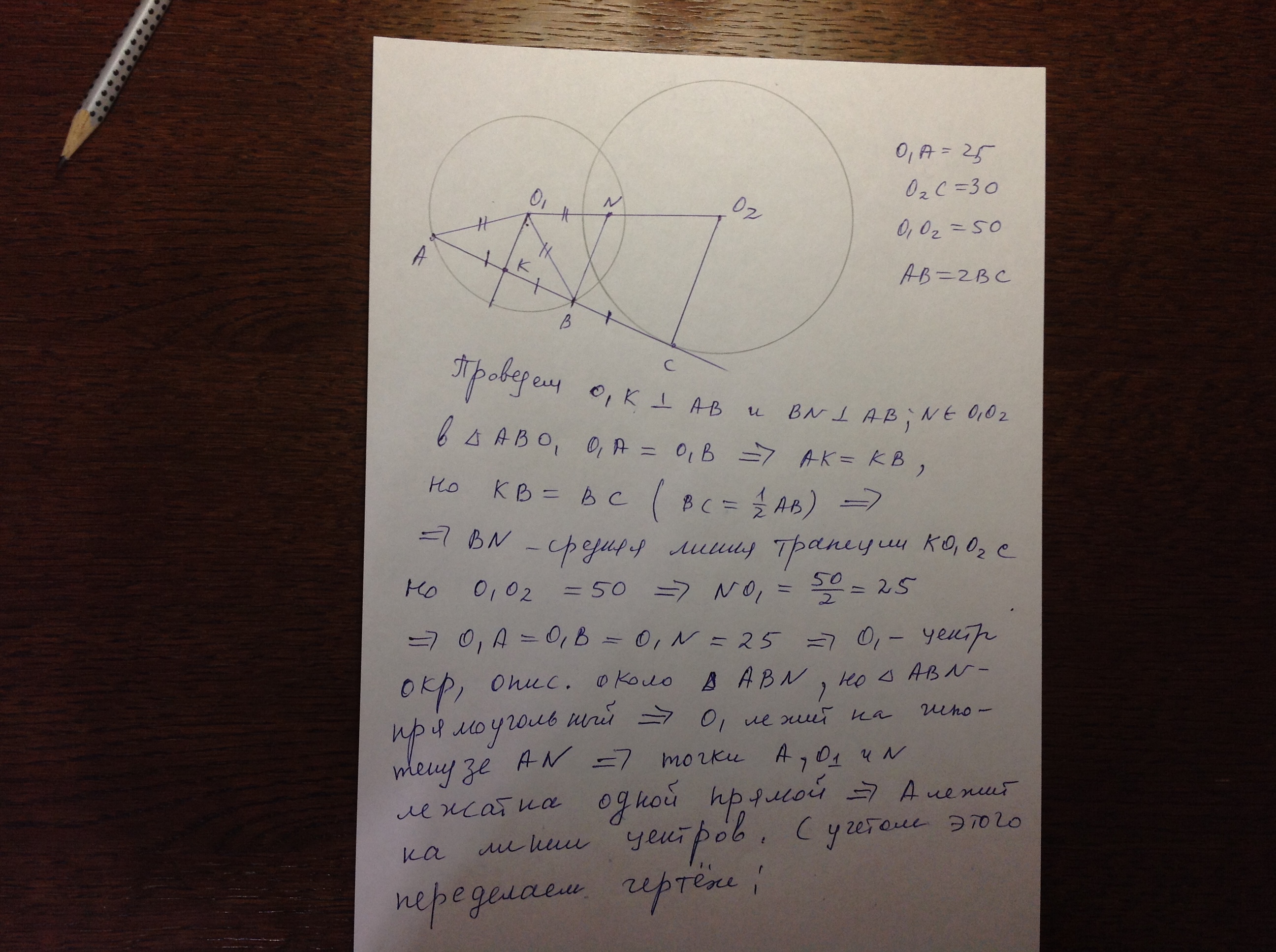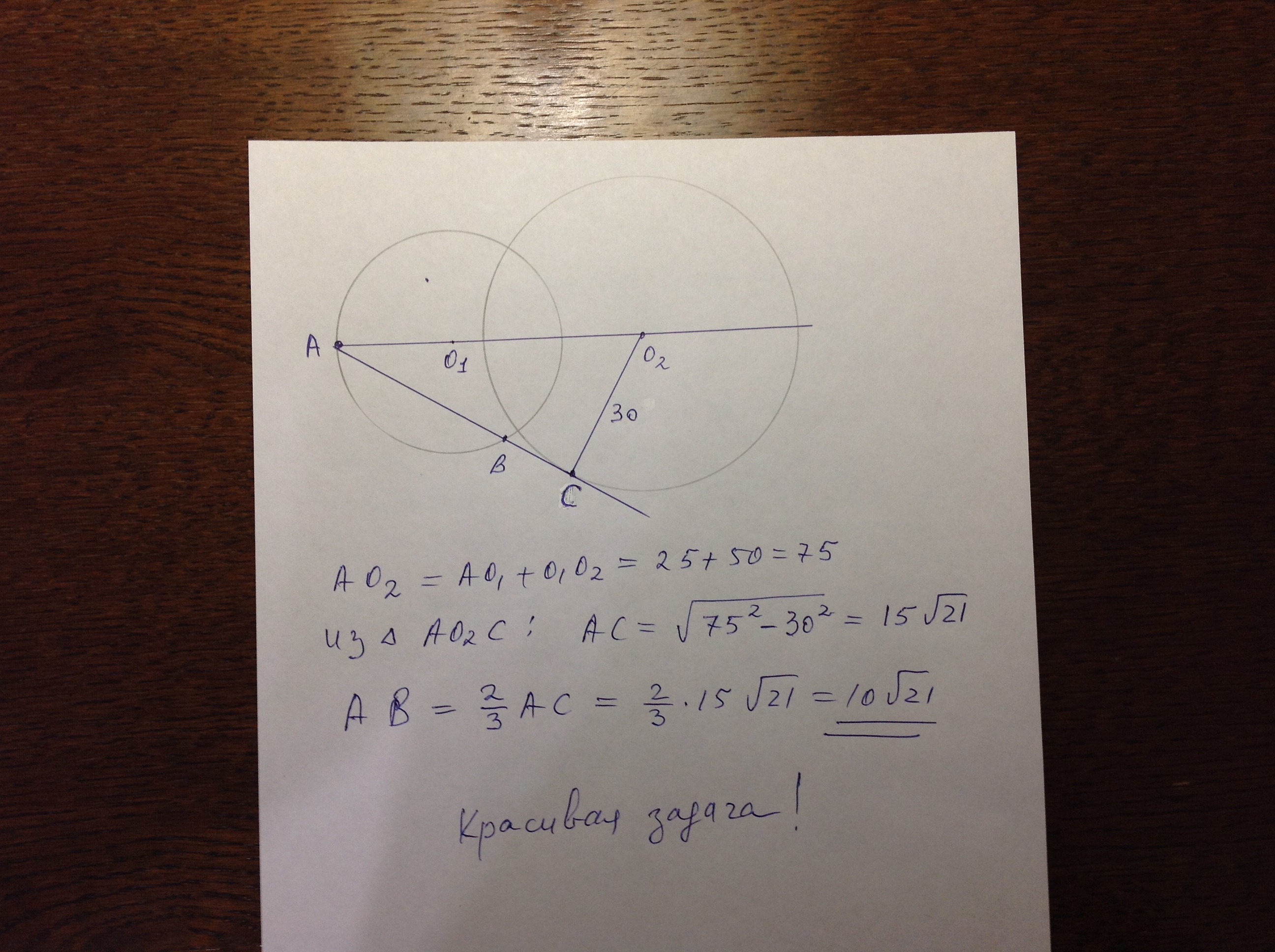 Одна из окружностей имеет радиус 25, вторая 30. Некоторая прямая пересекает меньшую окружность в точках А и В и касается большей в точке С.