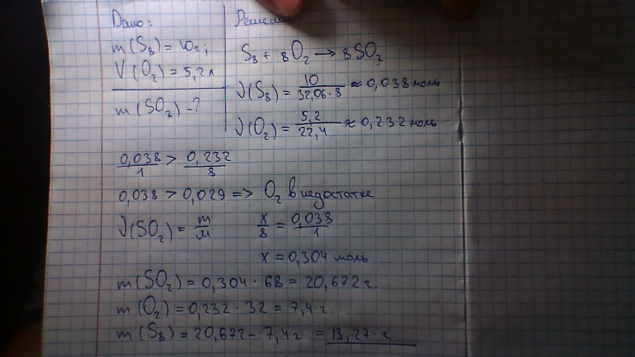Рассчитайте массу so2, который образуется при взаимодействии 10г S8 и 5.2дм3 O2.какой реагент и какой массы остался после реакции?