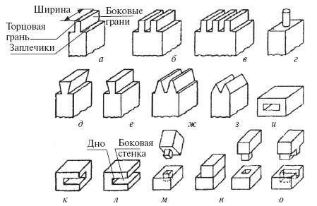 Виды шипов: а – одинарный; б – двойной: в – многократный; г – круглый; д – «ласточкин хвост»; е – односторонний «ласточкин хвост»; ж, з – зубчатые; и – гнездо; к, л – проушины; м – глухой шип; н – шип в потемок; о – шип в полупотемок.