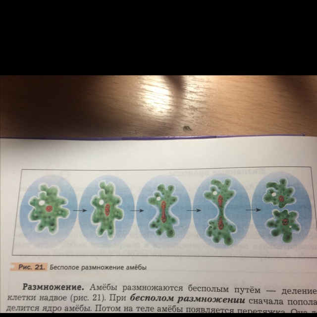 Амёбы размножаются бесполым путём в благоприятных условиях, то есть делением на две части