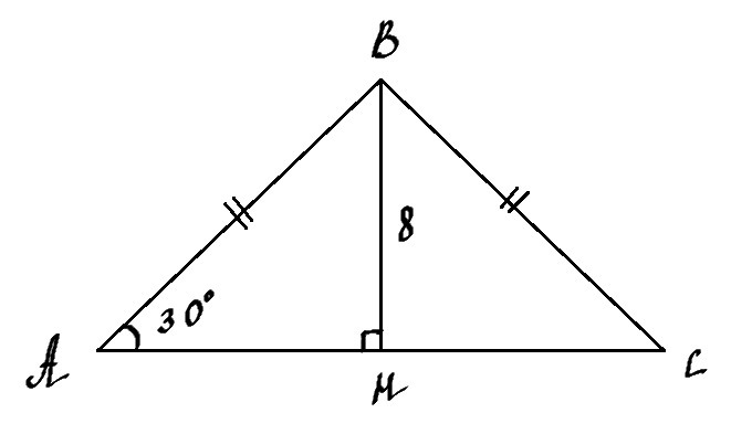 В треугольнике ΔАВН ∠А = 30°, а лежащий напротив него катет ВН = 8 (по условию).