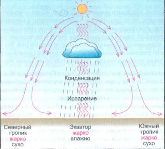 В экваториальных районах всегда жарко, поэтому воздух здесь горячий и насыщенный водяным паром. Но чем выше он поднимается, тем сильнее остывает. При остывании воздуха происходит конденсация водяного пара, и из образовавшихся облаков идет дождь. Однако воздух еще не достаточно теплый и продолжает подниматься. Наконец он остывает настолько, что вверх подниматься не может. Он мог бы опускаться вниз, но в этом направлении его не пускают поднимающиеся от земли потоки теплого воздуха. И тогда воздух начинает растекаться в стороны от экватора и постепенно опускаться. Эти нисходящие потоки воздуха достигают земной поверхности в районе тропиков. По мере приближения к поверхности Земли воздух все больше нагревается. Но он совершенно сухой, ведь всю влагу он уже отдал над экватором . Вот и формируются в районах Северного и Южного тропиков пояса сухости. В полярных районах всегда очень холодно, а значит, и очень сухо. ы