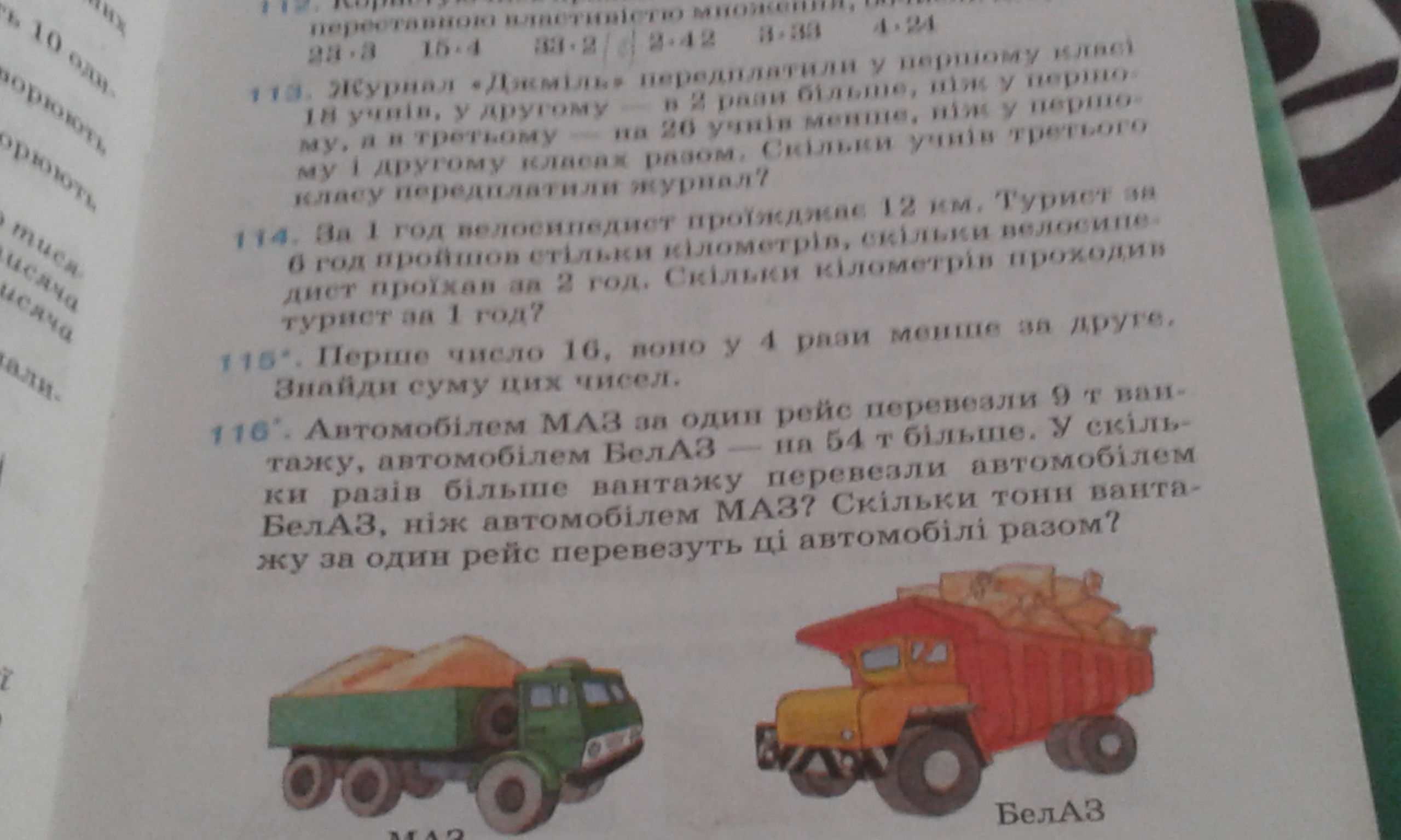 Автомобілем МАЗ за один рейс перевезли 9 т вантажу, автомобілем БелАЗ-на 54 т більше.У скільки разів більше вантажу перевезли автомобілем Б елАЗ, ніж автомобілем МАЗ? Скільки тонн вантажу за один рейс перевезуть ці автомобілі разом?