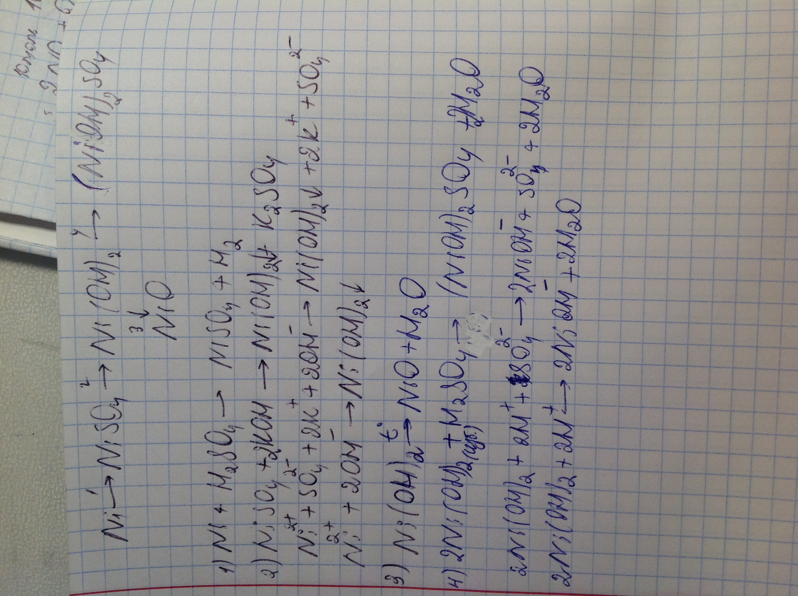 В 1 образуется сульфат никеля, во 2 гидроксид никеля и сульфат калия, в 3 оксид никеля и вода, в 4 гидроксосульфат никеля и вода.