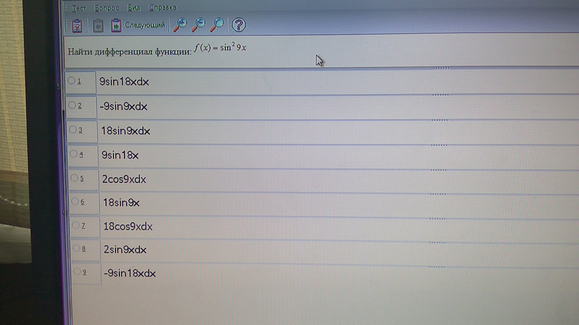 найти дифференциал функции: f(x)=sin^2 9x