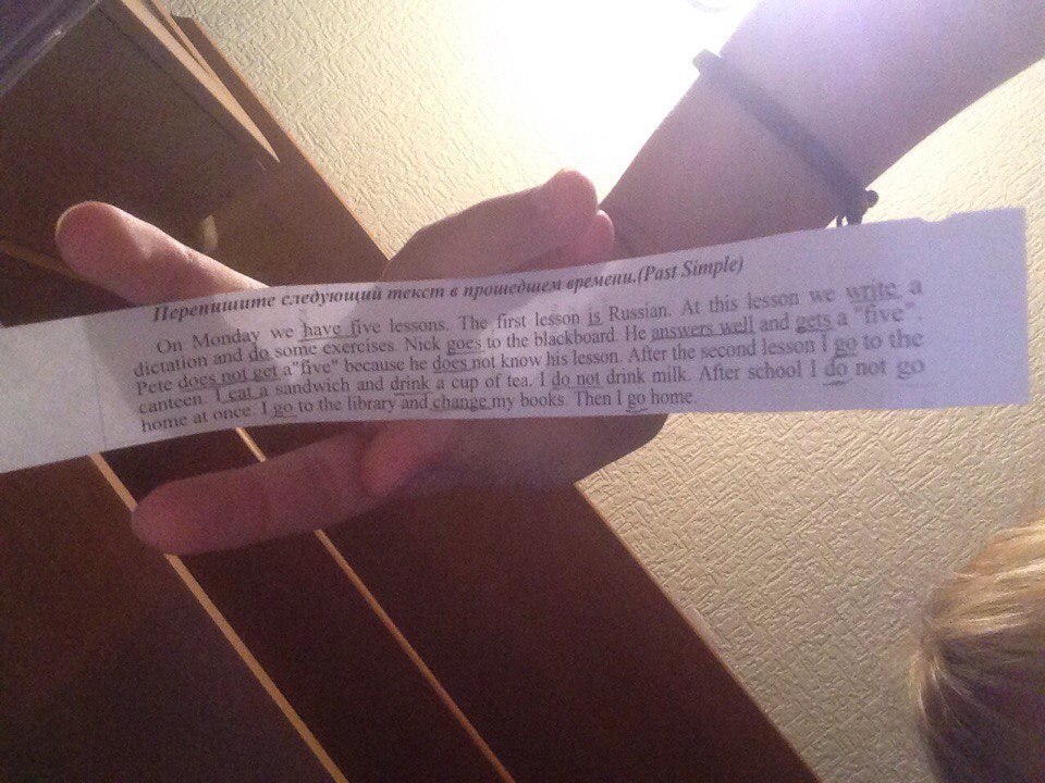 On Monday we had five lessons. The first lesson was Russian. At this lesson we wrote a dictation and did some exercises. Nick went to the blackboard. He answered well and got a "five". Pete did not get a "five" because he did not know his lesson. After the second lesson I went to the canteen. I ate a sandwich and drank a cup of tea. I did not drink milk. After school I did not go home at once. I went to the library and changed my books. Then I went home.