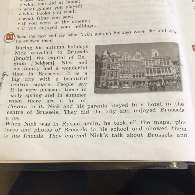 . Ник и gium его семья замечательно провели время в Брюсселе Это большой город с красивой центральной площади. Люди говорят, что это очень приятно там ранней весной и летом, когда есть много цветов в нем. Ник и его родители остались в гостинице в центре Брюсселя. Они сделали город и наслаждались Брюссель много. Когда Ник снова был в России, он взял все карты, и снимках фотографий Брюссель в его школу и показал их своим друзьям. Они пользовались разговоры Ника о Брюсселе и