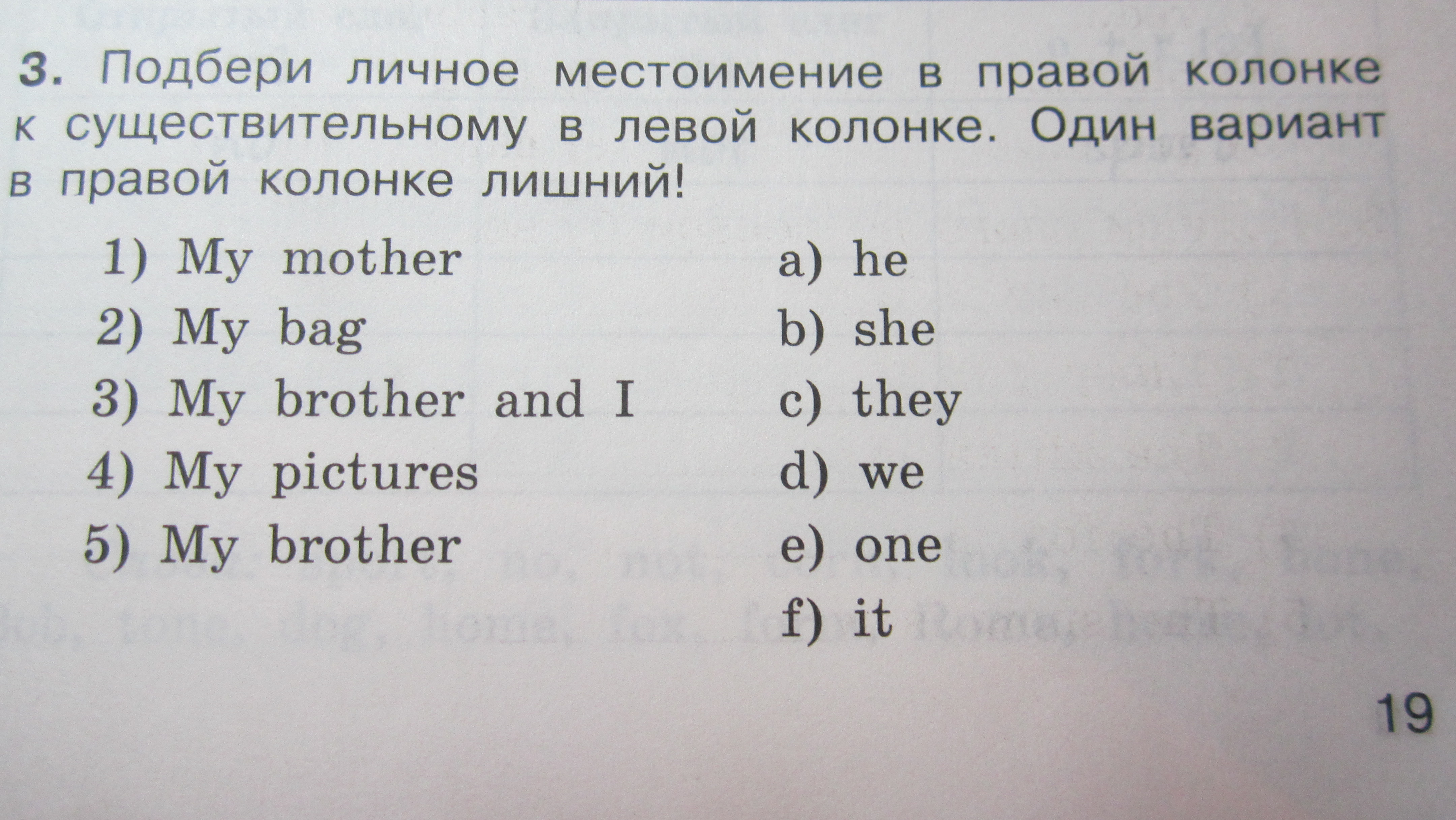 Подбери личное местоимение в правой колонке к существительному в левой колонке. Один вариант в правой колонке лишний!