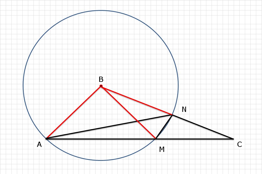 в реугольнике авс угол а=32 градуса, угол с=24 градуса. окружность с центром в точке в проходит через вершину а и сторону ас пересекается в точке м, а сторона вс в точеке n.