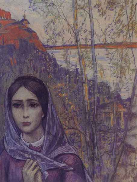 На картине художника Ильи Глазунова изображена Вера .В платке , на фоне города Санкт-Петербурга