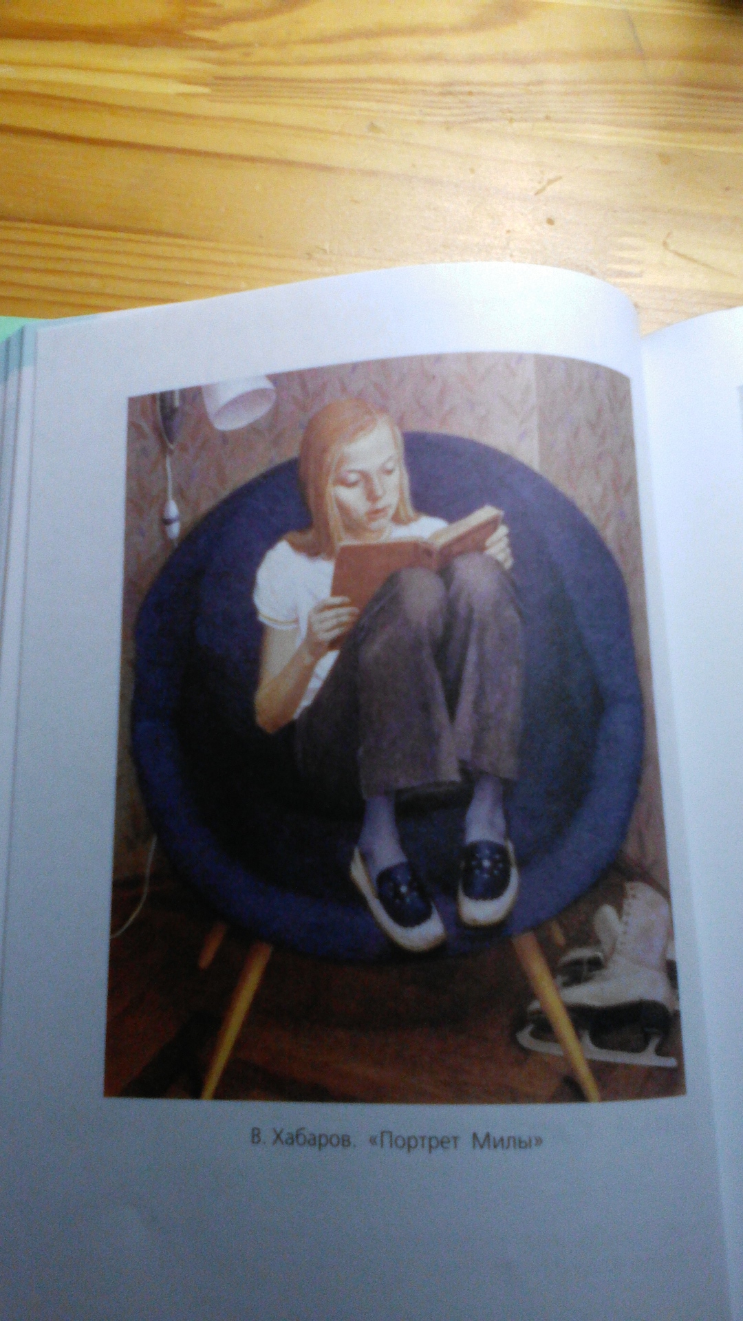 я рассматриваю картину В.Хабарова.На картине я вижу красивую девочку,её мимика описывает сосредоточеность на чтении книги.Сама Мила сидит на синем кресле,вокруг неё находится лампа,а на полу видны коньки.Мила одета в широкие штаны (брюки),футболку,синие слипоны.