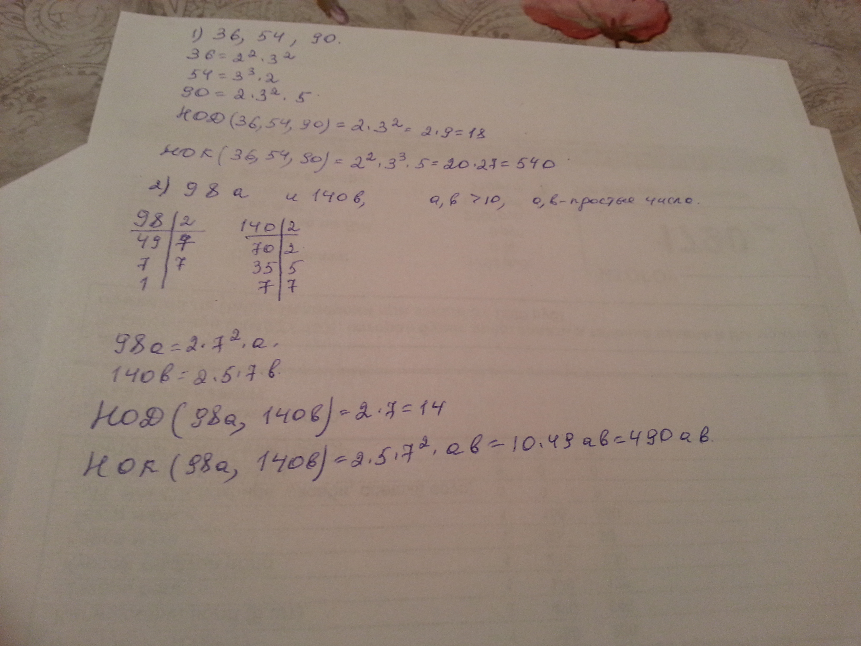 Найдите наибольший общий делитель и наименьшее общее кратное чисел а) 36, 54 и 90 б) 98a и 140b, где a и b - простые числа больше 10