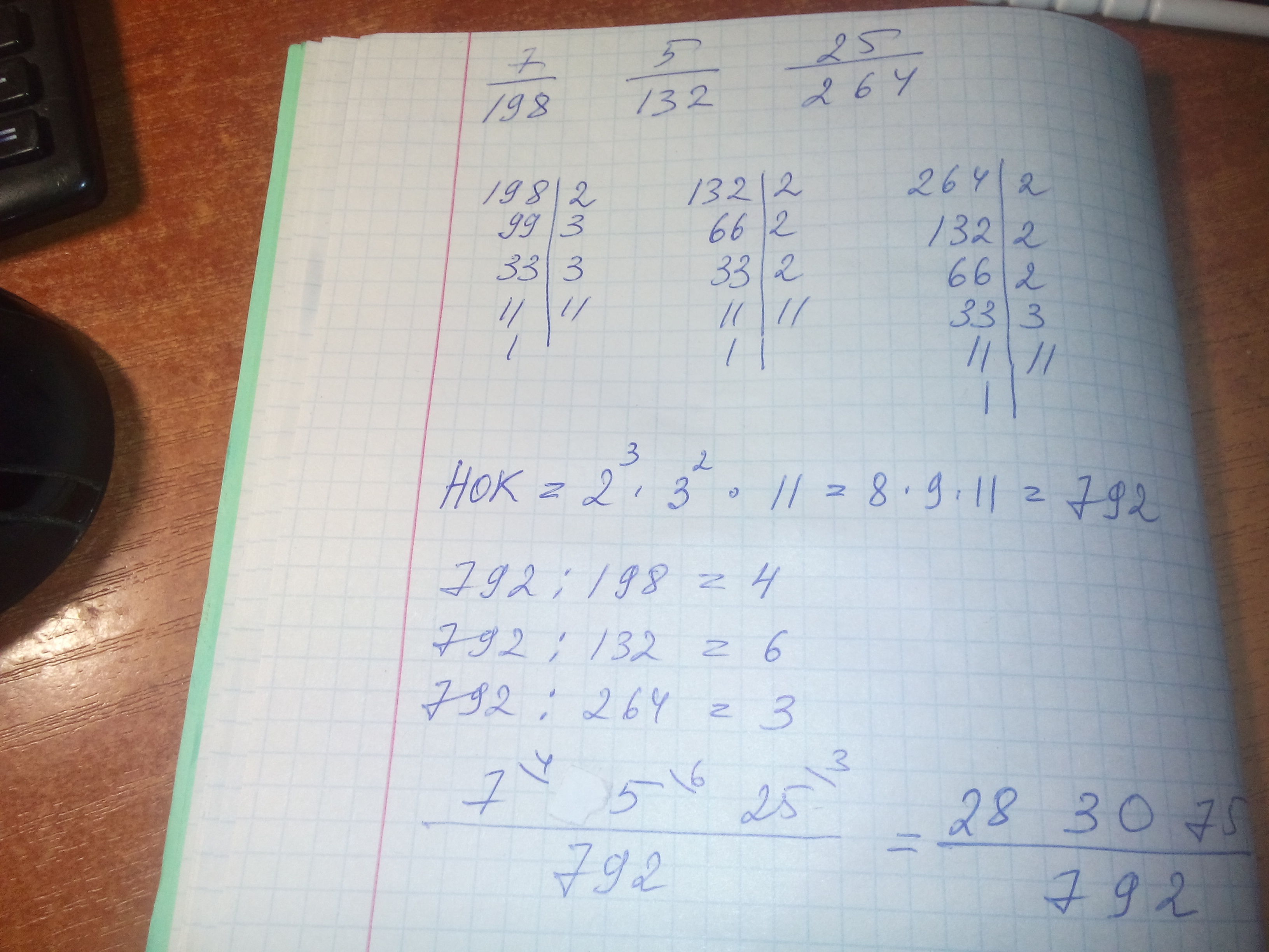 Найдите наименьшее общее кратное знаменателей дробей 7/198, 5/132 и 25/264 путем разложения их на простые множители и приведите эти дроби к наименьшему общему знаменателю.