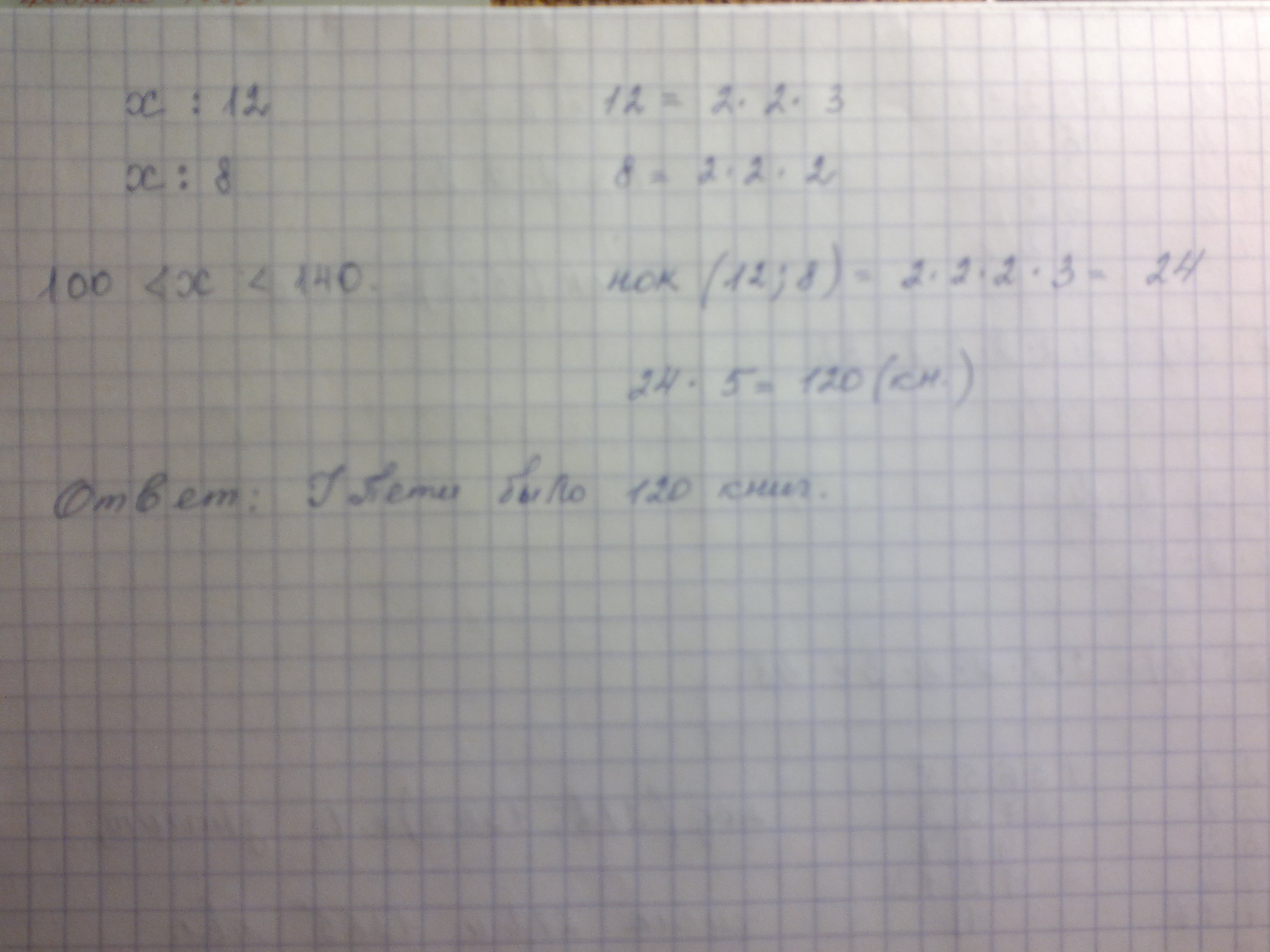 6.Петя расставил книги поровну на 12 полках, а потом переставил их, тоже поровну, на 8 полок. сколько книг было у Пети, если известно, что их было больше 100, но меньше 140