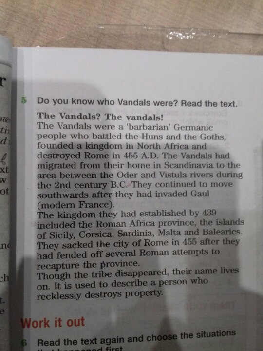 Вандалами были "варварские" германцы, которые сражались с гуннами и готами, образовавшие королевство в Северной Африке и и разрушили Рим в 455 Н.Э. Вандалы иммигрировали из своих домов в Скандинавии в местность между реками Ордер и Вистула в течение 2-ого века до Н.Э. Они продолжили перебираться к югу, затем они вторглись в Голь(современная Франция).