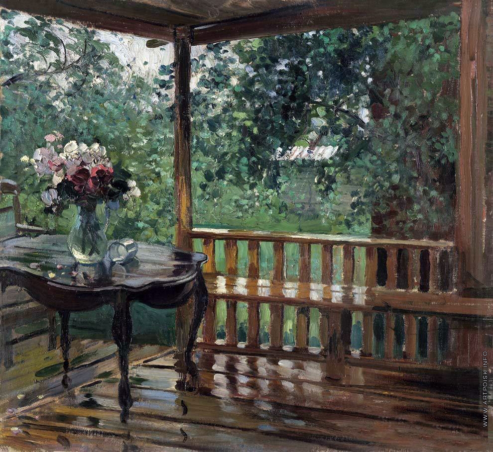 расскожи что там ты видинь ..упавшие листья ..и еше мокрая трава ...цветы стеклянной вазе ...и тд