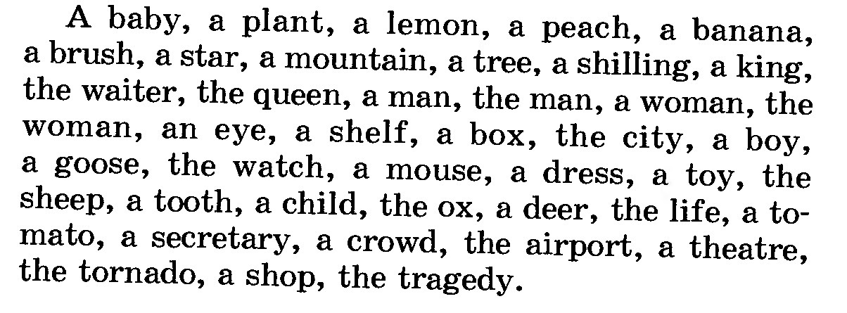 Babies, plants, lemons, peaches,bananas, brushes, stars, mountains, trees, shillings, kings, the waiters, the queens, men, the men, women, the momen, eyes, shelves, boxes, the cities,boys, geese, the watches, mice, dresses, toys, the sheep, teeth, children, the oxen, deer, the lives, tomatoes, secretaries, crowds, the airports, theatres, the tornadoes, shops, the tragedies.