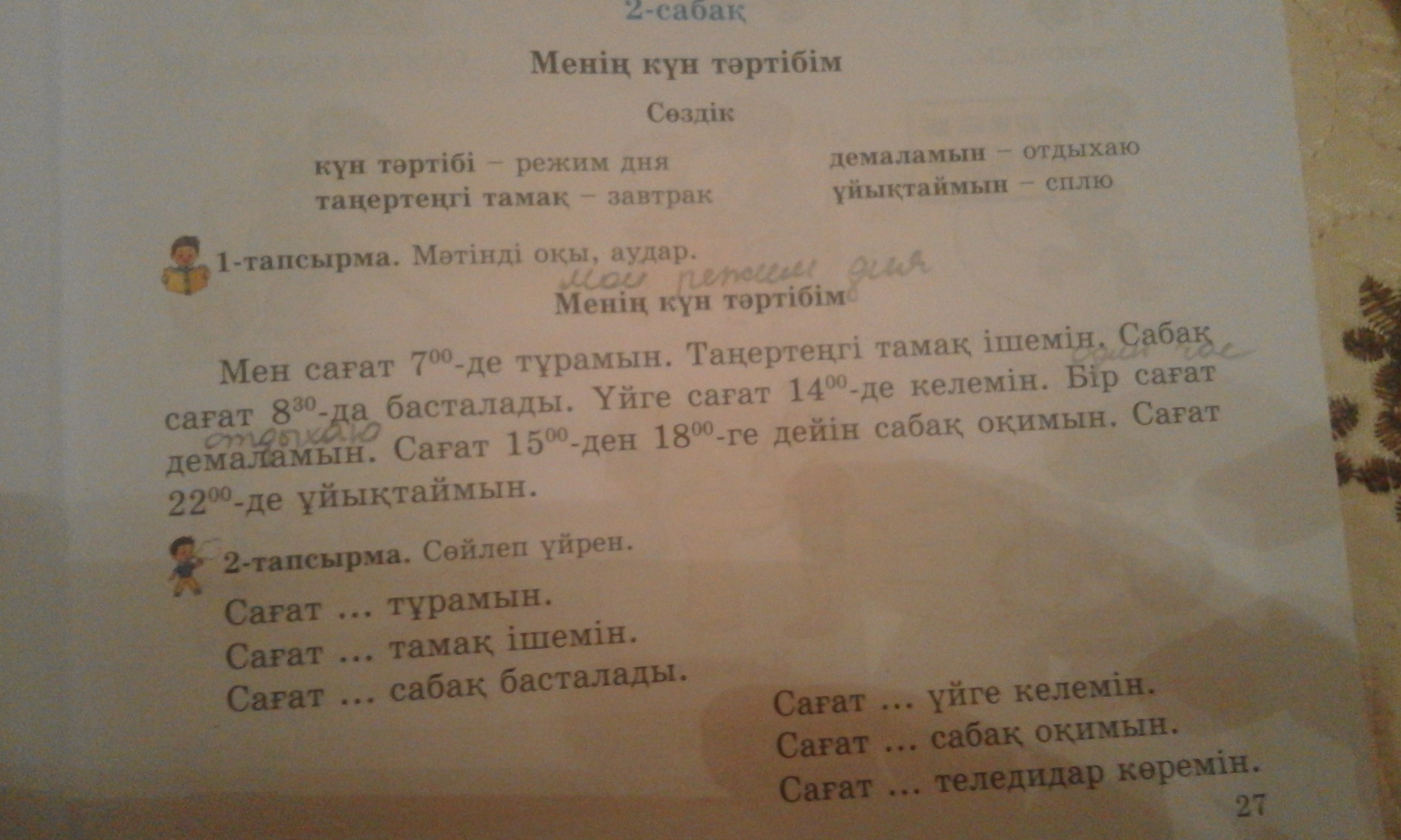 я встаю 7.00.Завтракаю.Уроки начинаются8.30.Домой прихожу в 14.00.Один час отдыхаю.С 15.00-18.00 учу домашнее задание.В 22.00 ложусь спать.