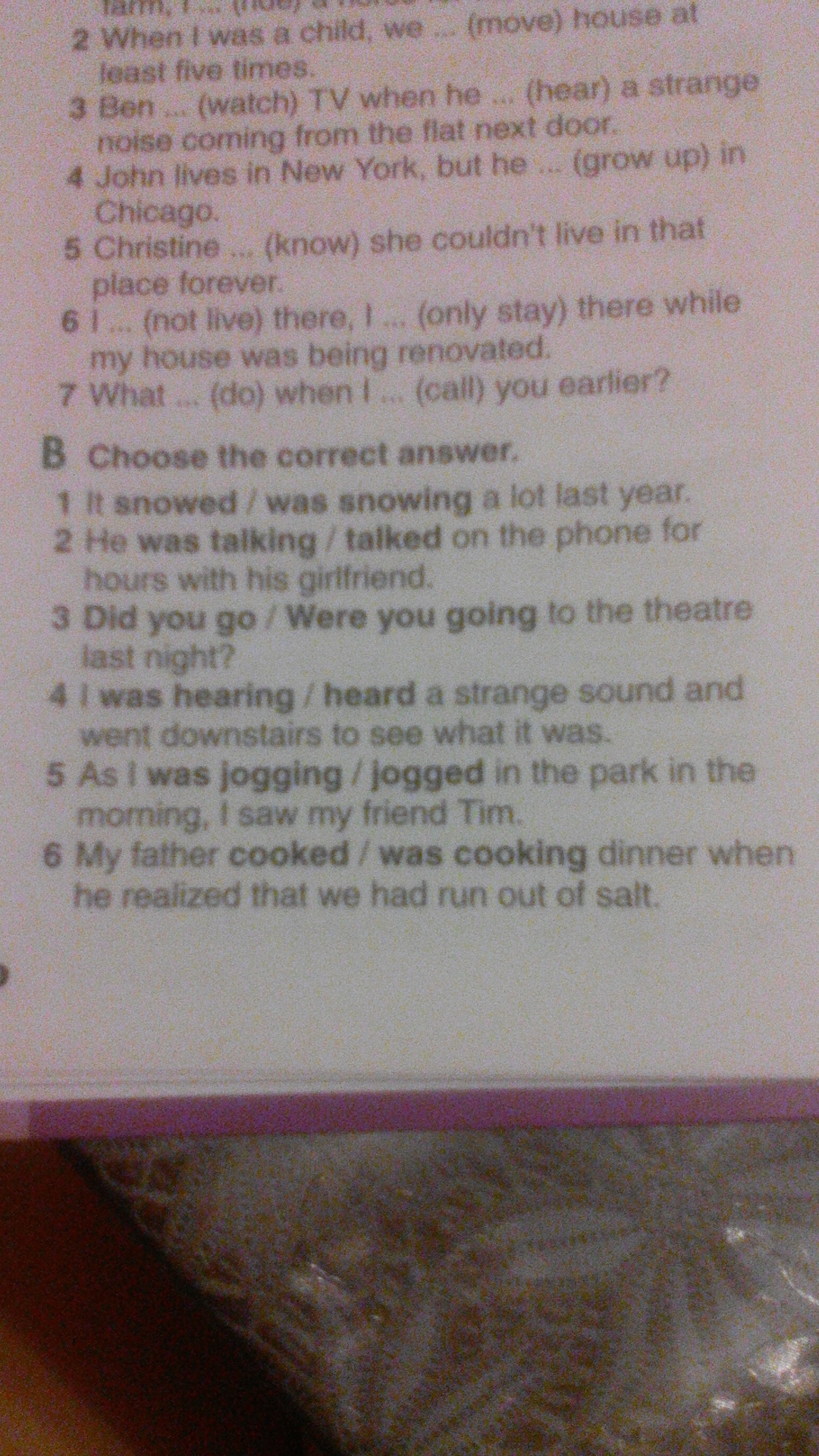 1/ It snowed.... 2/He was talking..........3/Did you go.......................? 4/I heard...... /глаголы восприятия невозможно в Continous Tense !/