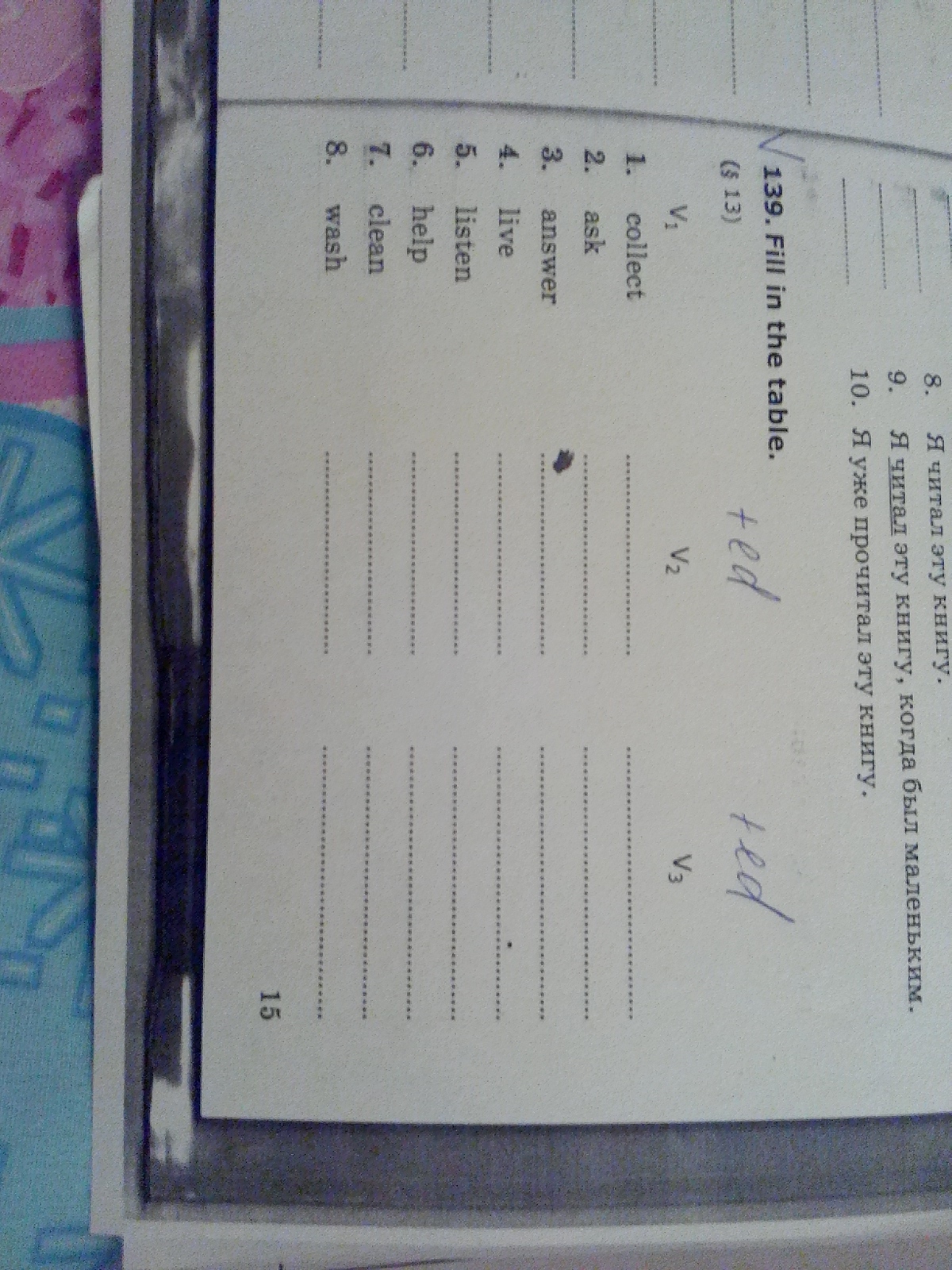 collect - collected - collected. ask - asked - asked. answer - answered - answered. live - lived - lived. listen - listened - listened. help - helped - helped. clean - cleaned - cleaned. wash - washed - washed.